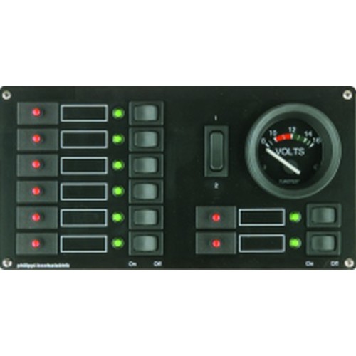 8 Stromkreise mit thermischen Schutzschaltern 8 A, Leuchtdiodenanzeige, Wippschaltern. Voltmeter mit LED-Beleuchtung und Umschalter (1-0-2).