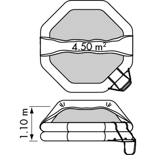 Für den Einsatz auch unter Extrembedingungen entwickelt : mehrere Kenterschutzsäcke mit großem Volumen, großer Treibanker, korrekte Aktivierung auch bei -15°C, isolierender Doppelboden, selbstaufrichtendes, leuchtend oranges Dach, Außenleuchte 4.3 cd, 1500 cm2 lichtreflektierende und radarreflektierende Streifen.