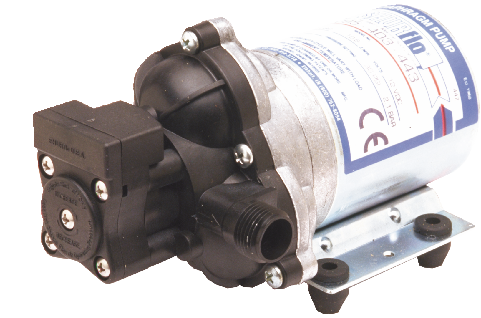 SHURflo TRAIL KING 10. Trockenlaufsichere Druckwasserpumpe. Spannung 12 V. Max. Förderleistung 10,6 l/min. Abschaltdruck 2,1 bar. Max. Stromaufnahme 4 A.