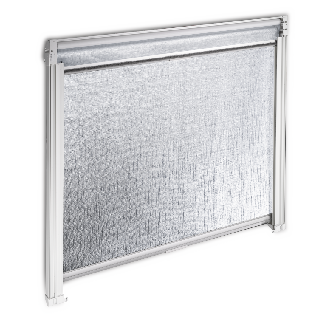 Dieses Verdunkelungsrollo für rahmenlose Fenster ist mit einem Fliegengitter ausgestattet und lässt sich dank des federbetriebenen Mechanismus mit Geschwindigkeits-kontrolle mühelos aufrollen.
