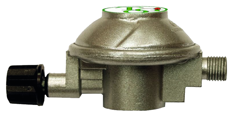 Regler 1,0 kg/h, 50 mbar mit Absperrventil für Druckgasdosen mit Universalgewinde 7/16, Eingang IG 7/16-28 UNEF, Ausgang