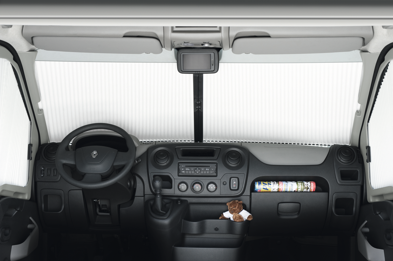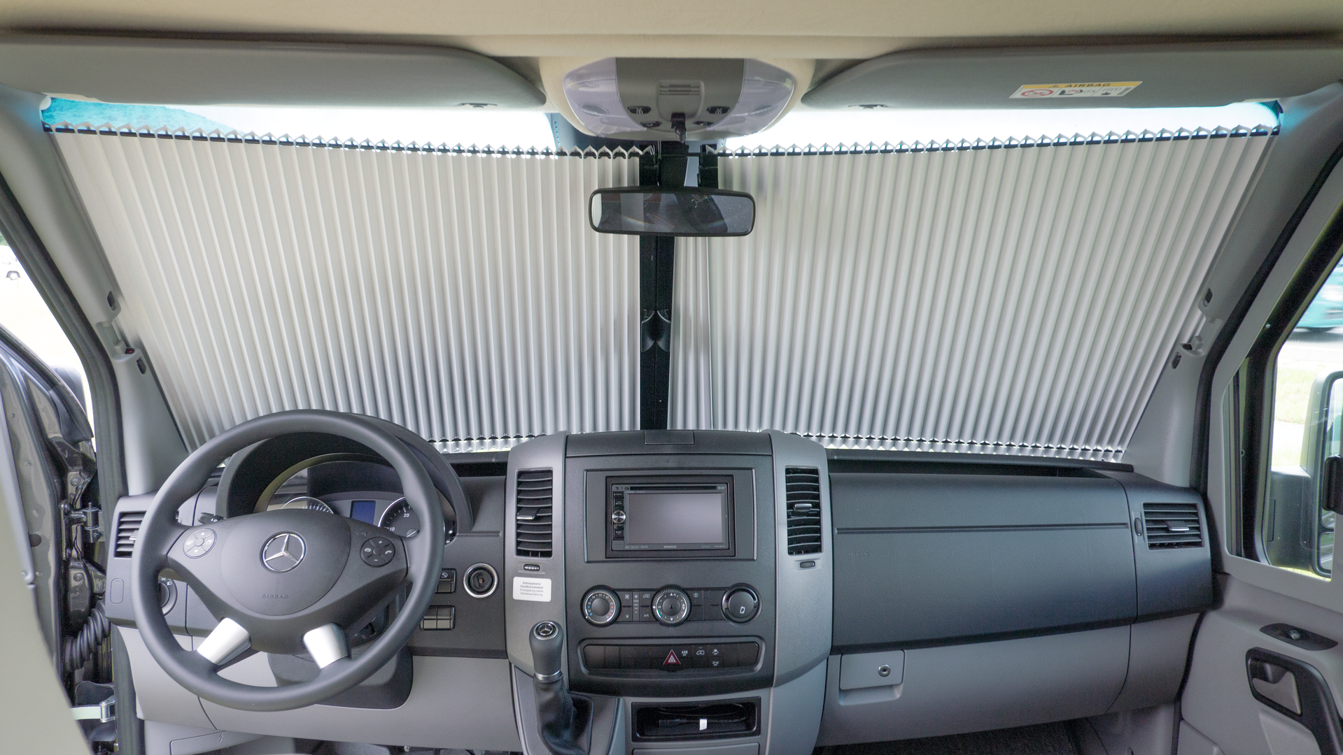 Große Front- und Seitenscheiben am Reisemobil bieten eine schöne Aussicht, aber auch guten Einblick für neugierige Augen und wenn die Sonne vom Himmel brennt, heizt sich der Innenraum durch die großen Flächen schnell auf.