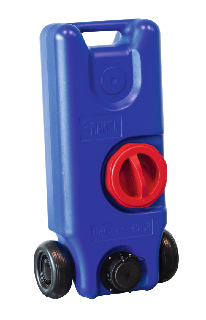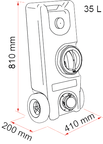 Frischwassertank mit einem eingelassenen, bequemen Griff und zwei massiven Rollen für den einfachen Transport auch auf unebenen Flächen. Aus atoxischem Material hergestellt, KTWzertifiziert.