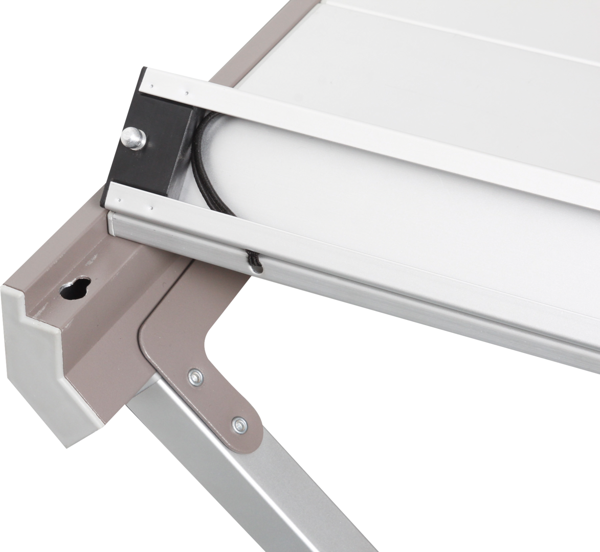 Eigenschaften: Rolltischplatte mit silber eloxierten Lamellen (Gapless-System), mit integrierter Wasserwaage, sehr stabiler Rahmen aus Aluminium-Vierkantrohren und zentraler Stabilisierungsstange, höhenverstellbares Tischbein, mit praktischer Netzablage und Transporttasche (100 % Polyester) mit zwei separaten Fächern.