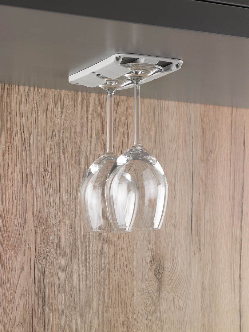 Rotweinglashalter zum sicheren Einschub von zwei Gläsern mit Stielfuß bis max.  ø 86 mm. Hängend oder stehend im Schrank oder Regal anzubringen. Auch während der Fahrt sind sie sicher verstaut. Schraubenset inklusive.