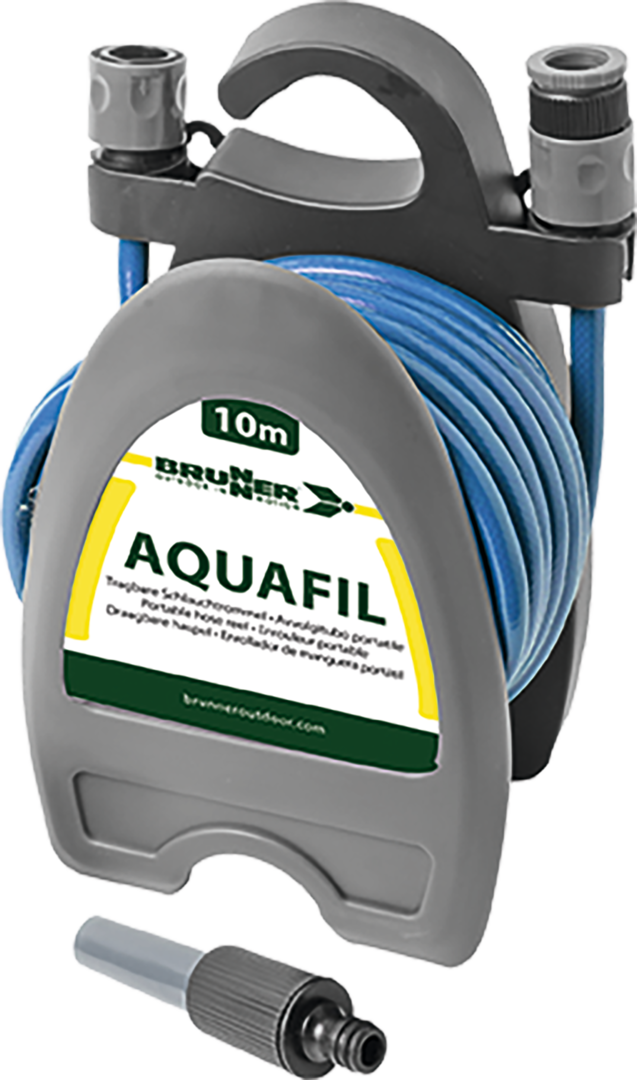 Schlauchtrommel AQUAFIL. Tragbare Schlauchtrommel mit lebensmittelechtem ?“ PVC-Schlauch und 2 Schnellkupplungen. Gestell aus widerstandsfähigem Kunststoff. Kompakt, leicht und einfach zu transportieren. Komplett mit Spritzdüse. Geeignet für eine Vielzahl von Anwendungen.Schlauchlänge 10 m.