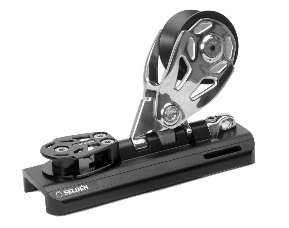 Genua-Rutscher mit aufgestelltem PBB60 Block und Hundsfott. Passend für Selén System 42 (für Yachten bis ca. 65 Fuß/20 Meter)