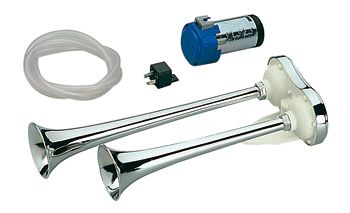 Wichtige Herstellerangaben: Elektropneumatisches Doppelhorn mit Trichter aus verchromtem Plastik. Mit Kompressor und Montageset.
