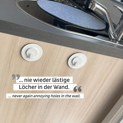 Das runde Pad (5 cm) kann auf nahezu jeder beliebigen Oberfläche angebracht werden. Einfach Schutzfolie abziehen, Pad ‚hinkleben‘, Haken anbringen und fertig ist die smarte Lösung. Dank spezieller Gel-Klebeschicht sind silwy Pads beliebig oft rückstandslos entfernbar, abwaschbar und wiederverwendbar.