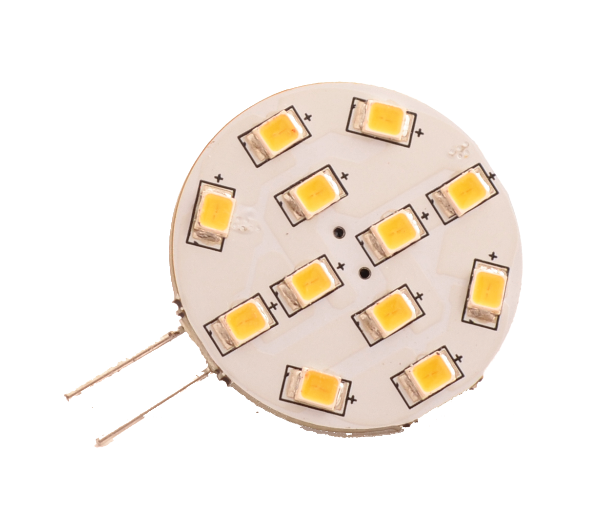 Sockel G4, 12 V, Verbrauch 2 W (entspricht ca. 20 W), Leuchtwinkel 120°, Lichtfarbe 4500 K, Lichtstrom 200 lm, ø 30 mm.