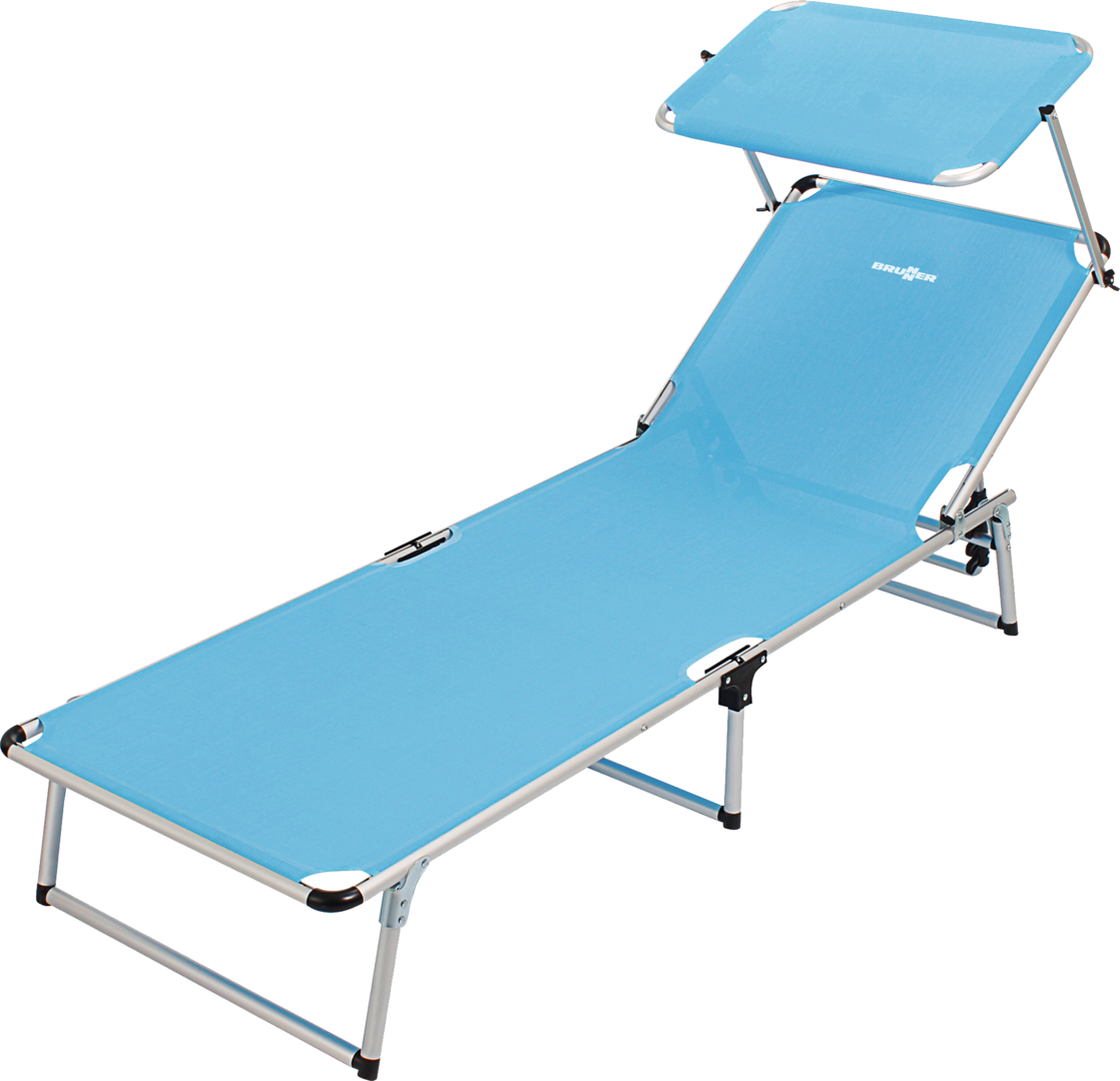 3-Bein-Sonnenliege mit praktischem Sonnenschutzdach. Bezug aus Syntex Plus (30 % PES, 70 % PVC), Gestell aus Aluminium.