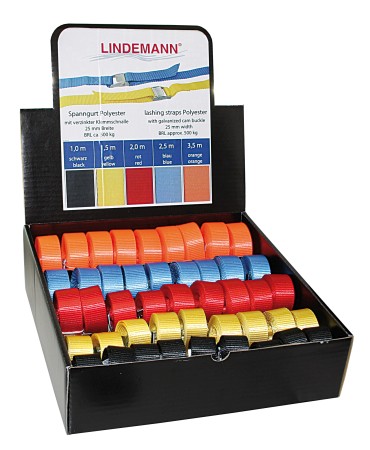 Wichtige Herstellerangaben: Farbige Spanngurte mit verzinkter Klemmschnalle und 25 mm Polyester Gurtband.