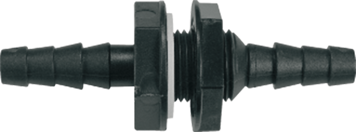 Gerade Tankdurchführung. Zur Entnahme oder Entlüftung in Kanistern und Wassertanks, mit Kontermutter und Dichtung. Schlauchanschluss beide Seiten 10/12 mm ø.