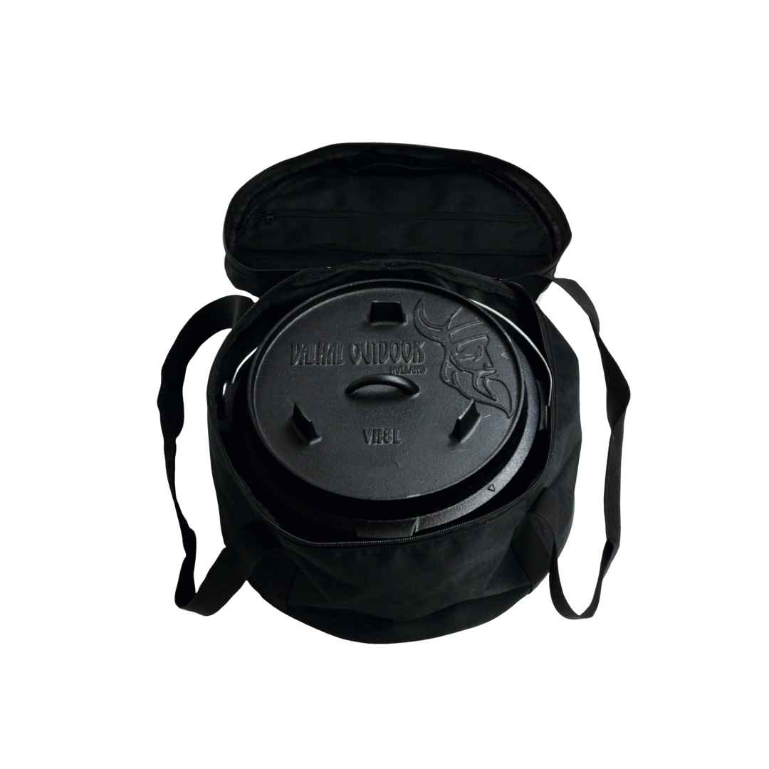 Tasche für Feuertopf. Tasche aus robustem Nylon um Ihren Feuertopf zu schützen und mitzunehmen. Der Boden ist verstärkt und innen befinden sich Ablagefächer, eine mit Reißverschluss. Die Tasche ist für Feuertöpfe bis einschließlich 8 l geeignet, sowohl mit als auch ohne Beine.