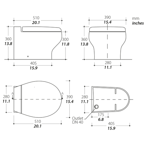 Die kurze Version dieses Modells ist für den Einbau auf einem Podest konzipiert, die in der Regel 10 cm / 3,9 Zoll hoch sind. Zu diesem Zweck wird die Höhe der Keramikschale auf 36 cm reduziert, um die normale Sitzhöhe von 46 cm anzugleichen.