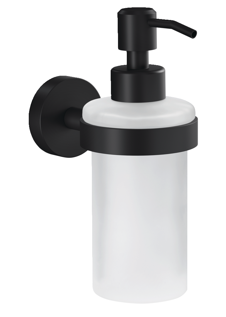 Der Satinglas-Pumpspender für Flüssigseife mit Halter in mattem, urbanem Schwarz ist ein Accessoire für moderne Bäder.