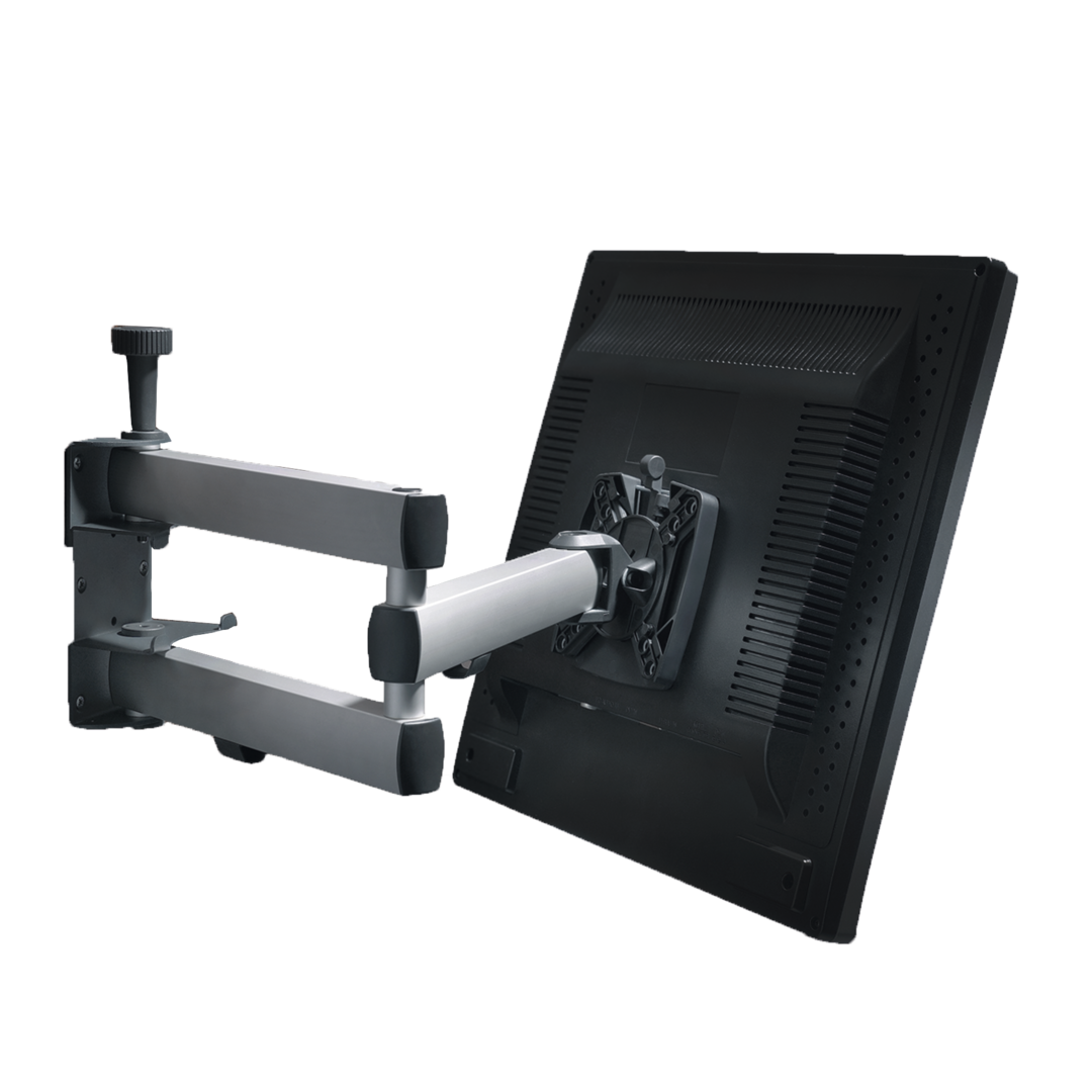 Mit Doppelgelenkarm, komfortabler Wandverriegelung und Schnellverschlussplatte zum schnellen und einfachen Entfernen des Bildschirms. Extrem großer Neigungswinkel. Belastbar bis 7,5 kg. Armlänge jeweils 250 mm, Gesamtlänge 577 mm.