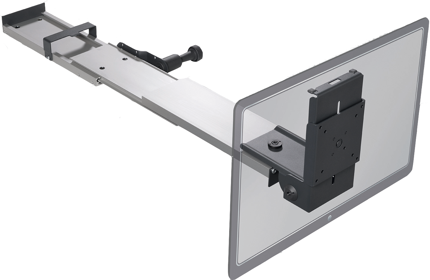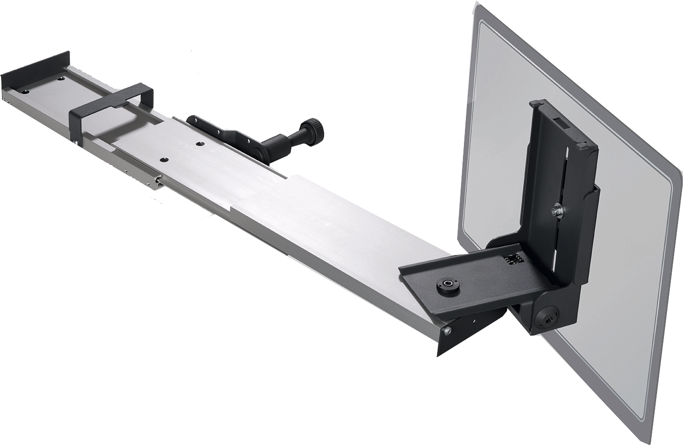Arretierhebel ca. 413 x 230 x 70 mm, Länge auseinandergezogen ca. 883 mm, stufenlos in der Länge ausziehbar 470 mm. Silberfarben eloxiert. Tragkraft max. 6,5 kg.