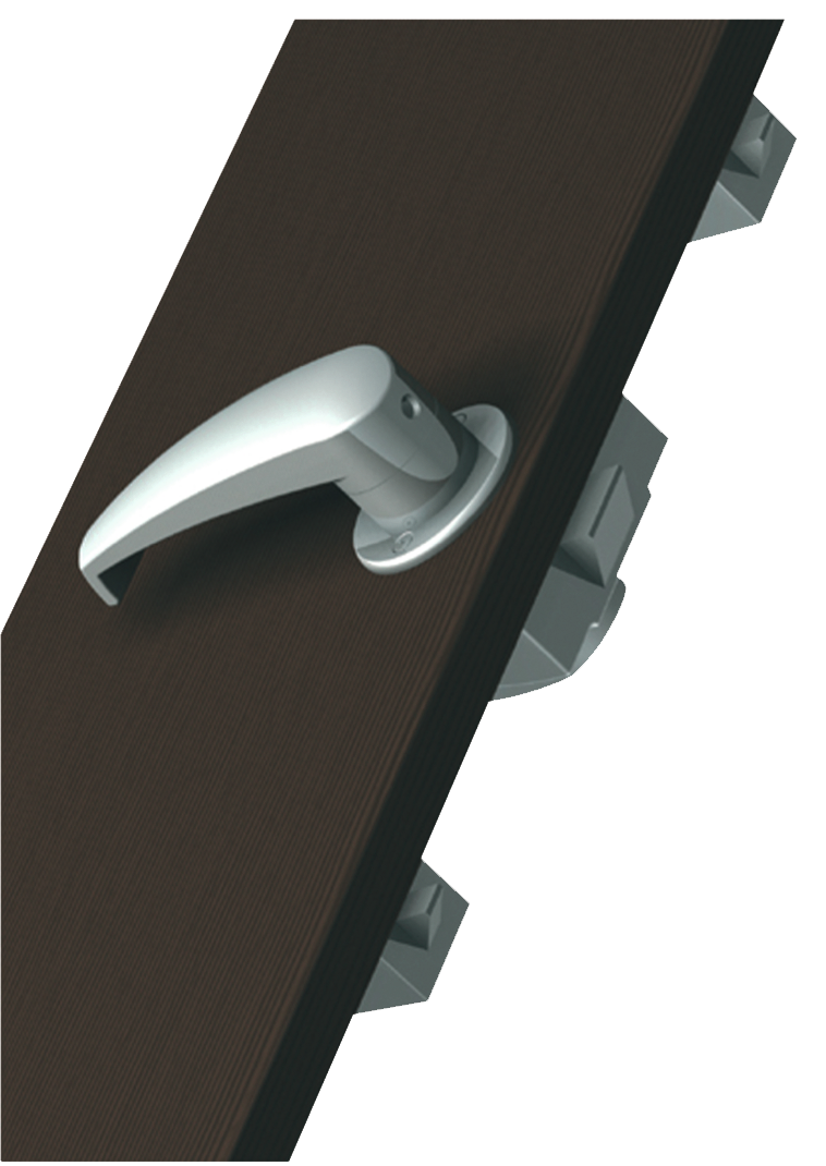Aufschraub-Fallenschloss mit Drehstangenausschnitten (links und rechts verwendbar), 3-Punkt-Verriegelung, Länge variabel durch kürzbare Drehstangen.