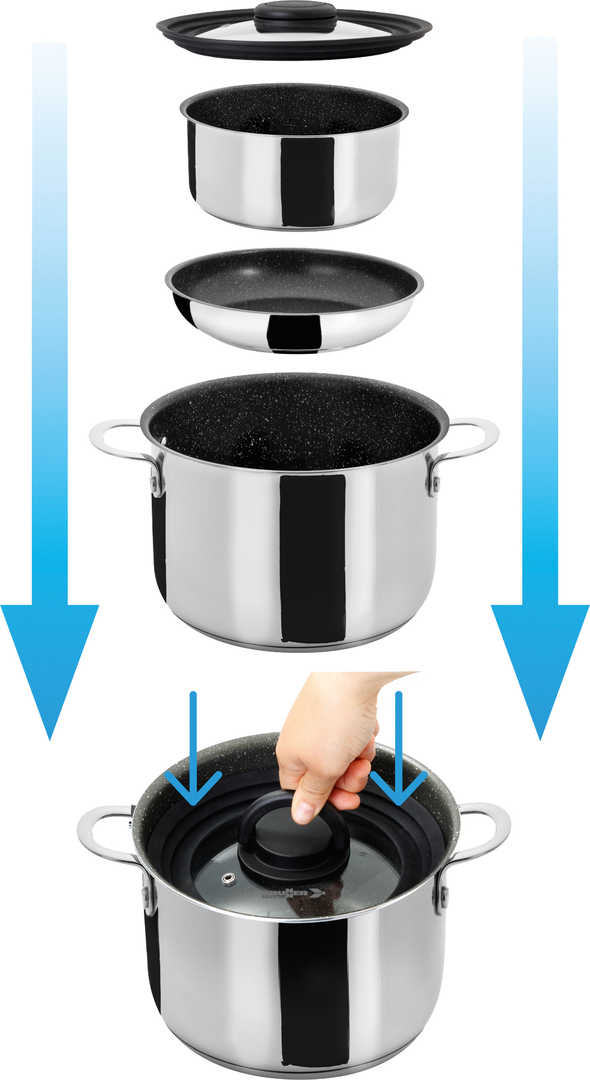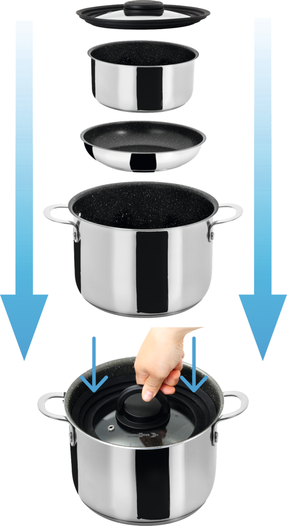 Qualitativ hochwertige Topfsetkollektion in platzsparendem Design. Töpfe und Deckel sind aus hochwertigem, spiegelglänzendem Edelstahl gefertigt. Bestens geeignet für Gas-, Elektro-, Keramik- und Induktionsherde. Spülmaschinengeeignet.