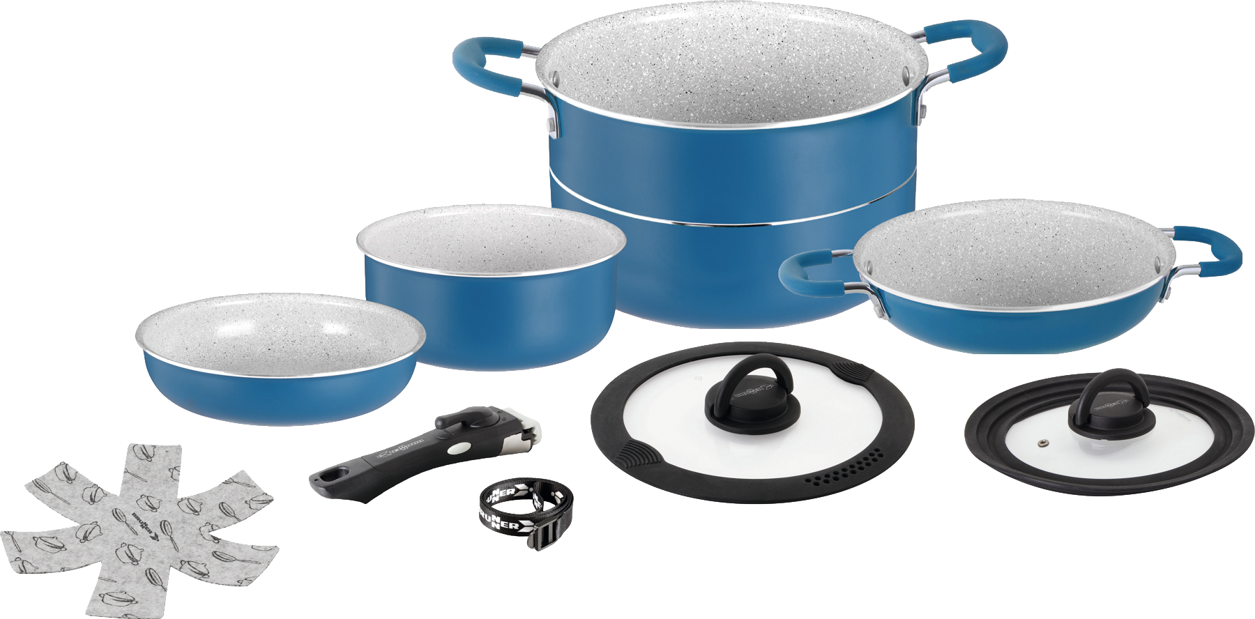 Kochtopfset aus 100 % recyceltem Aluminium. Mit patentiertem VacuBlock-System. Kompakt verstaubar. Induktionsgeeignet. Inklusive praktischem Pfannenschutz.