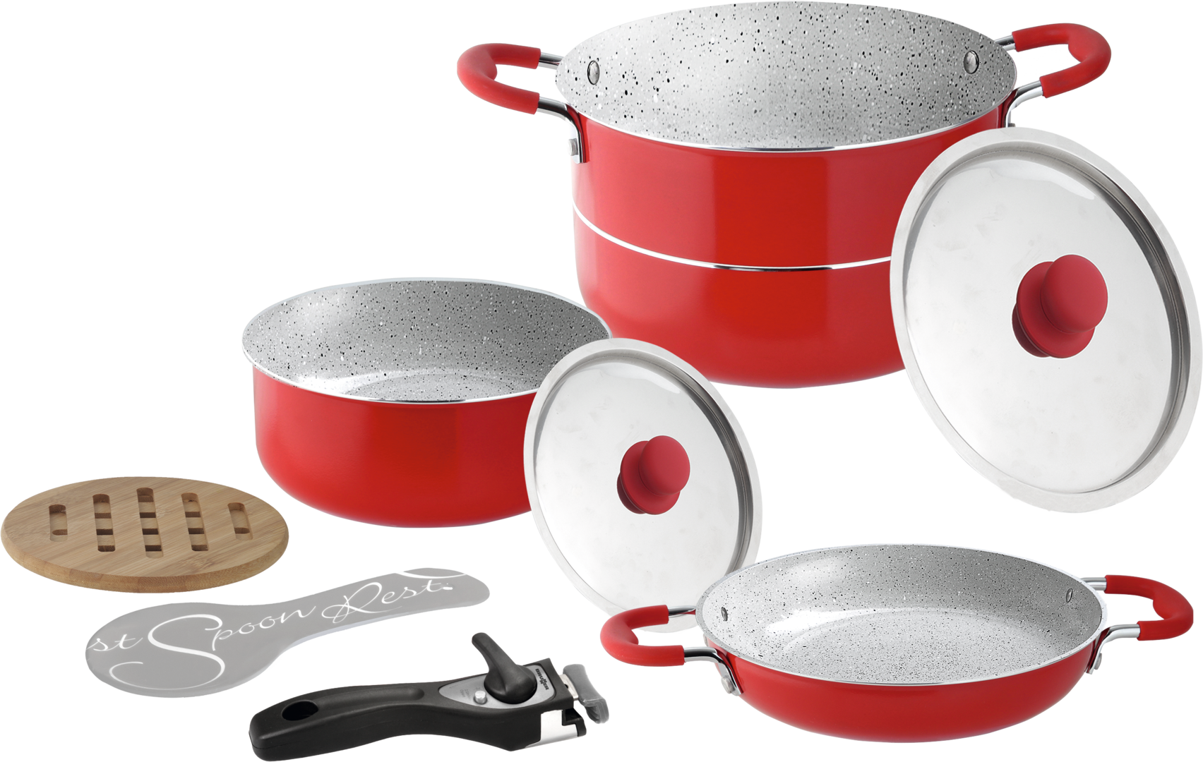 Kochtopfset COSMIC 8+2 ø 22. 10-teiliges Kochtopfset aus Aluminium mit langlebiger Antihaft-Keramikbeschichtung. Hohe Kratzfestigkeit. Silikonbeschichtete Griffe um Verbrennungen zu vermeiden und Rutschfestigkeit zu garantieren. Leicht zu reinigen. Induktionsgeeignet. Set bestehend aus 1 Topf ø 22 cm – 5 l, 1 Topf ø 18 cm – 1,4 l, 1 Pfanne ø 22 cm – 1,5 l, 1 Deckel ø 22 cm, 1 Deckel ø 18 cm, 1 Griffzange, 1 Kochlöffel, 1 Bambusuntersetzer, 1 Aufbewahrungstasche (31 x 54 x 27,5 cm) und 1 Gurt.