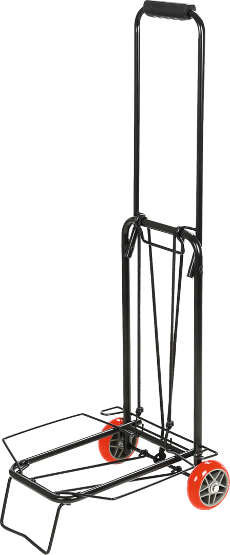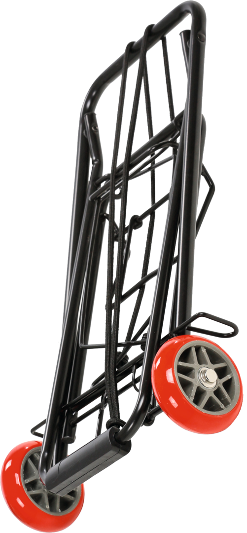 Praktischer Klapptrolley mit gut dimensionierten Laufrädern, die auch eine Verwendung auf unebenem Gelände ermöglichen.