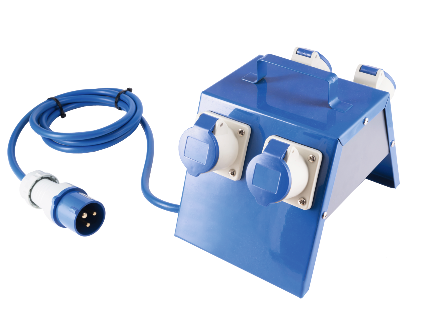 Eingang: 1 CEE-Stecker 230 V, 16 A, 3-polig. Ausgang: 4 CEE-Steckdosen 230 V, 16 A, 3-polig.