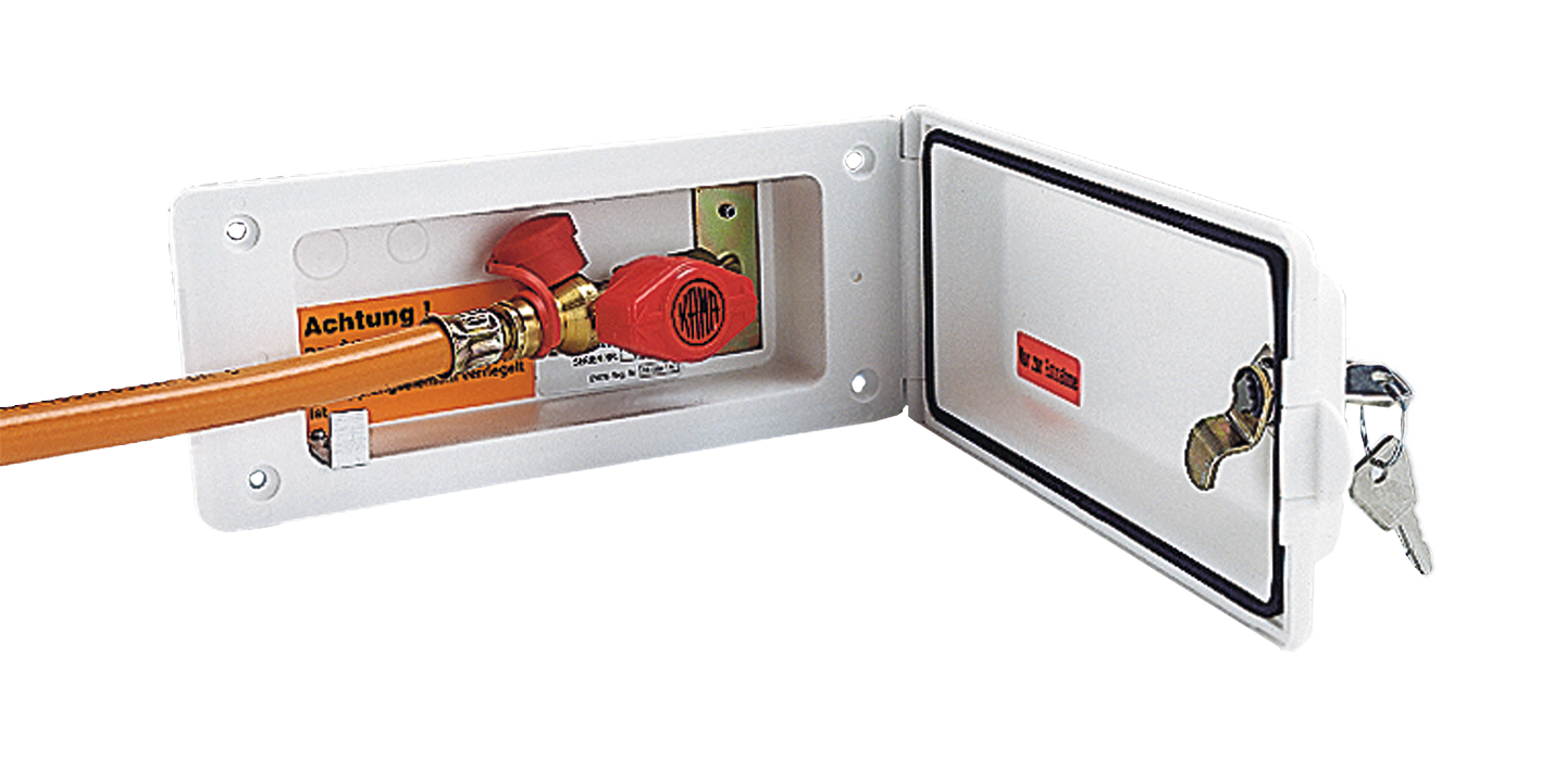Mit Schnellschlussventil und integriertem Absperrventil. Mit einrastbarem Deckel und Gummidichtung. Nach DVGW-Vorschrift, spritzwassergeschützt. Ausschnittmaß 158 x 68 mm.
