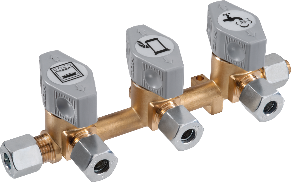 Schnellschlussarmatur, nur volle Offen- bzw. Geschlossenstellung. Max. zulässiger Druck: PS 5 bar. Mit Überwurfmutter Typ M und Schneidring Typ D.