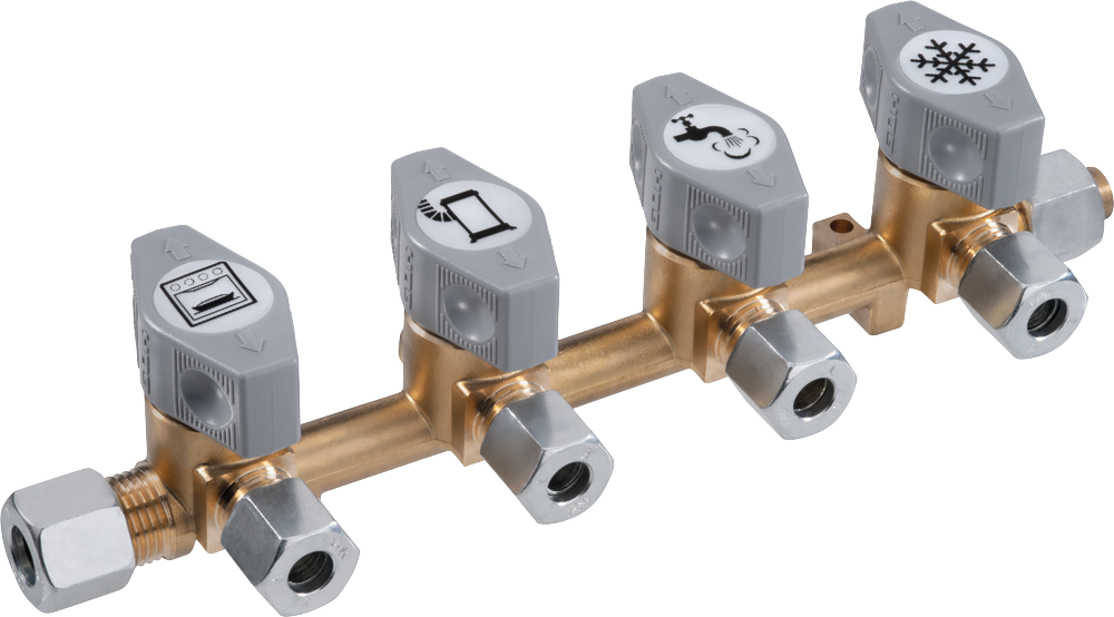 Schnellschlussarmatur, nur volle Offen- bzw. Geschlossenstellung. Max. zulässiger Druck: PS 5 bar. Mit Überwurfmutter Typ M und Schneidring Typ D.