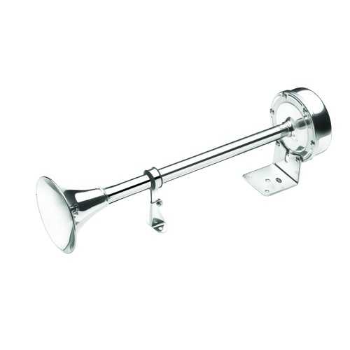 Elektrisches Schiffhorn. Gefertigt aus rostfreiem Edelstahl. In 12 Volt als Einzelhorn mit hohem oder tiefem Ton oder Doppelhorn lieferbar.