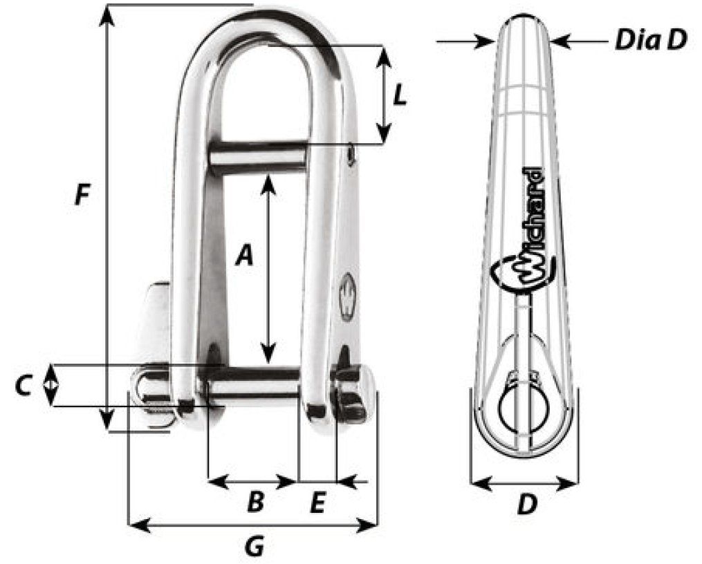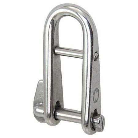 Schäkel aus rostfreiem Edelstahl AISI 316 mit Sicherungssteg und unverlierbarem Bolzen.
